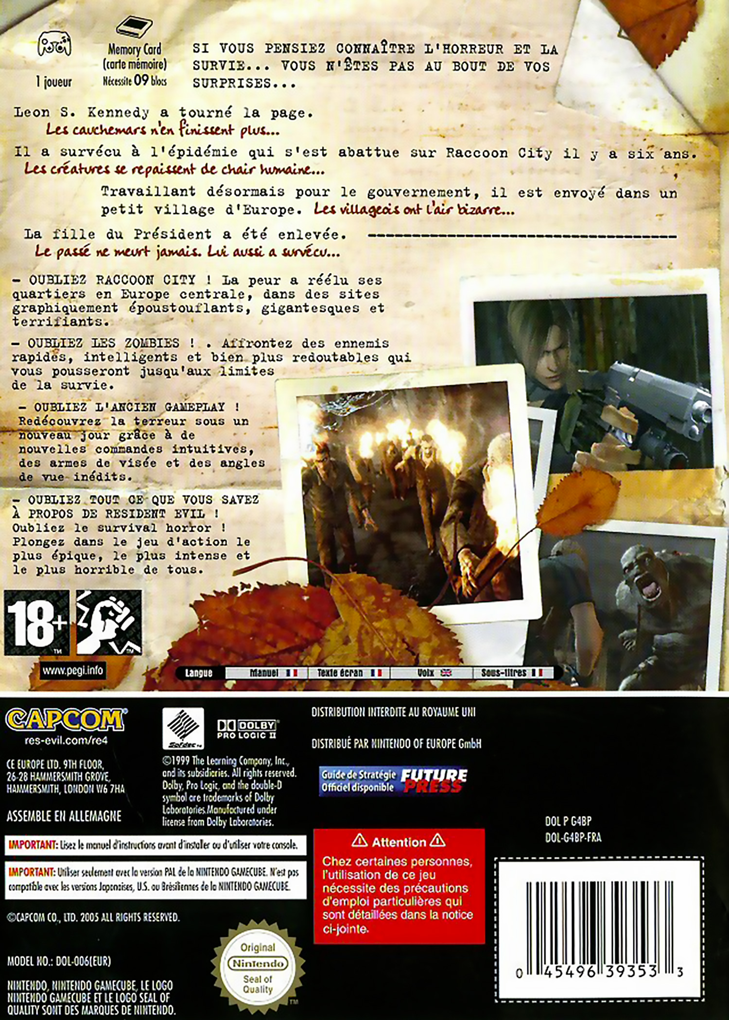 Vous incarnez Leon S. Kennedy qui doit retrouver Ashley, la fille du président des Etats-Unis, kidnappée par un groupuscule qui se cache en Europe. Progressez à travers les différents environnements d'un village reculé, en vous préparant à affronter une horde de zombies assoiffés de chair humaine. Vous pouvez également compter sur Ada (déjà présente dans Resident Evil 2) pour vous donner un coup de main.